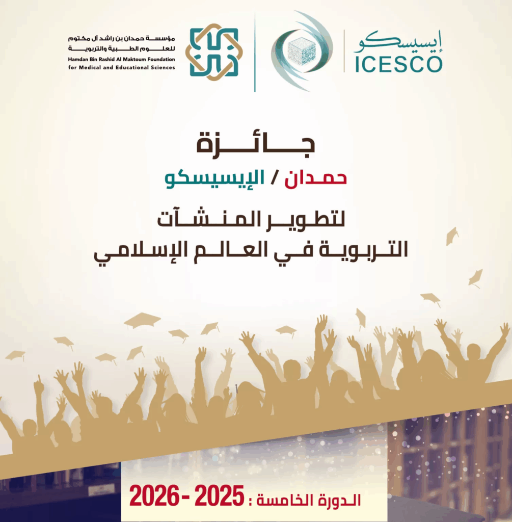تعلن منظمة العالم الإسلامي للتربية والعلوم والثقافة (إيسيسكو)، ومؤسسة حمدان بن راشد آل مكتوم للعلوم الطبية والتربوية، عن فتح باب الترشح للدورة الخامسة من جائزة الإيسيسكو – حمدان لتطوير المنشآت التربوية في العالم الإسلامي 2025 – 2026، التي تهدف إلى تحفيز المبادرات التطوعية والأعمال الخيرية في قطاع التعليم، ودعم تطوير البنى التحتية والمنشآت التربوية في دول العالم الإسلامي.