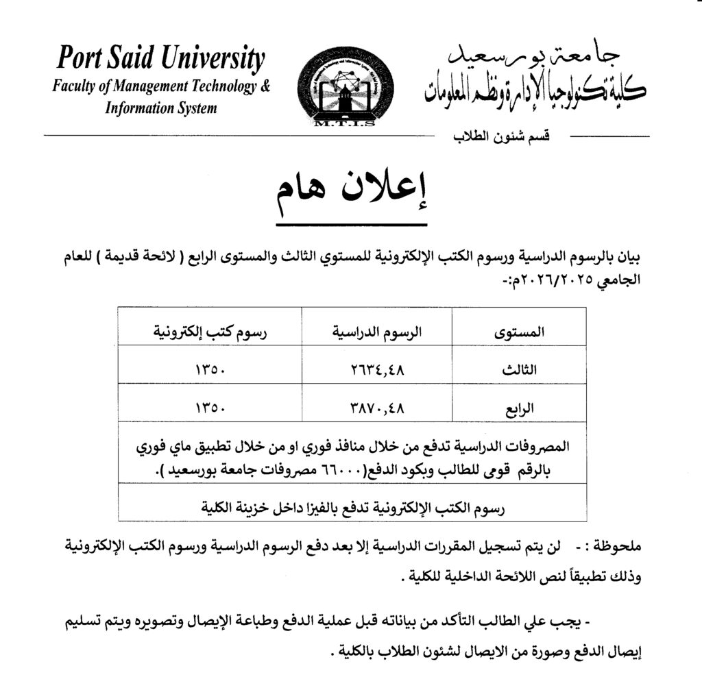 مصروفات الفصل الدراسي الأول 2025/2026 لطلاب اللائحة القديمة