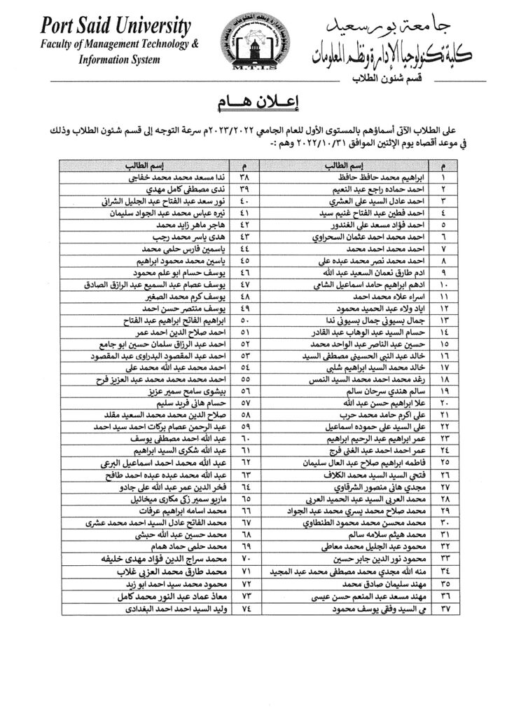 اعلان هام لطلاب المستوى الأول 2022/2023